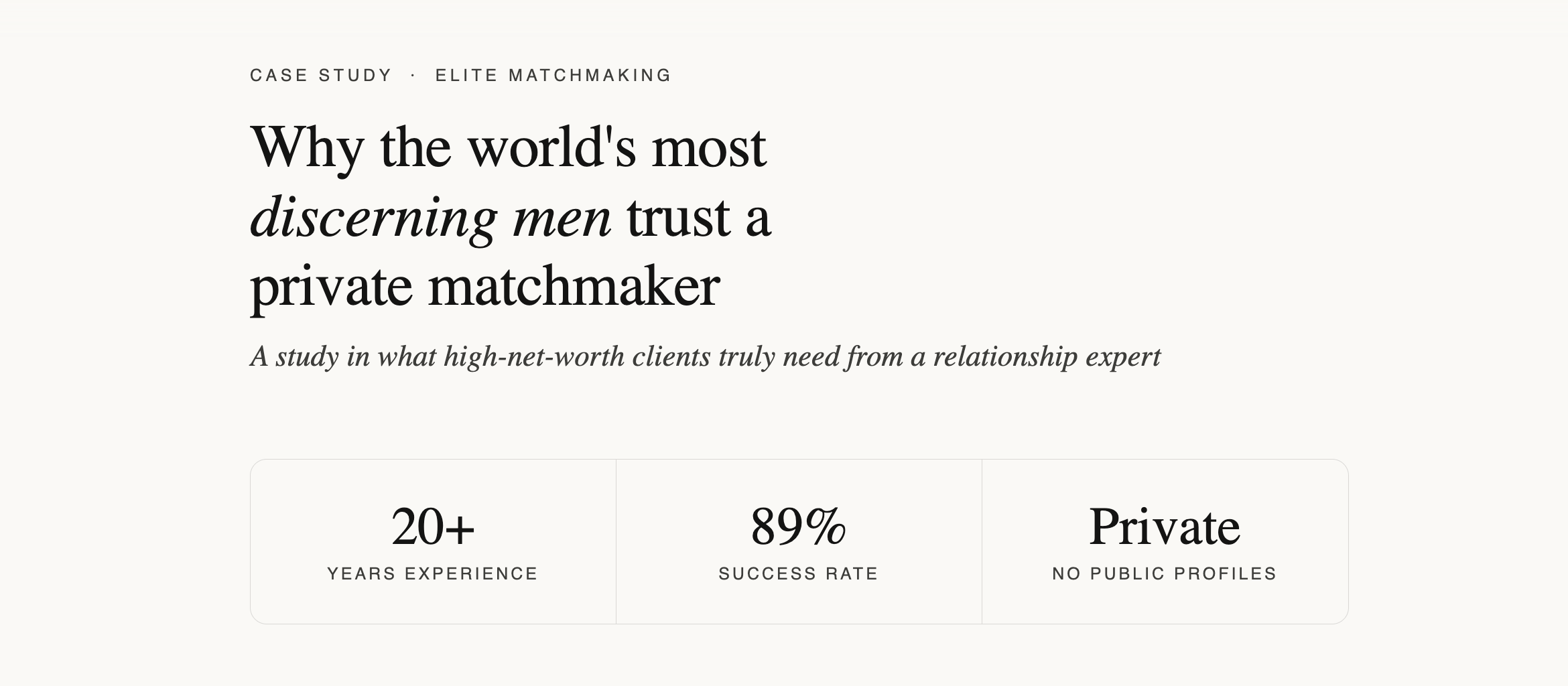 My clients enter serious relationships within the first year at an 88 to 90% rate. The industry average for boutique services is 60 to 70%. Dating apps deliver meaningful relationships for fewer than 9% of high-net-worth professionals.