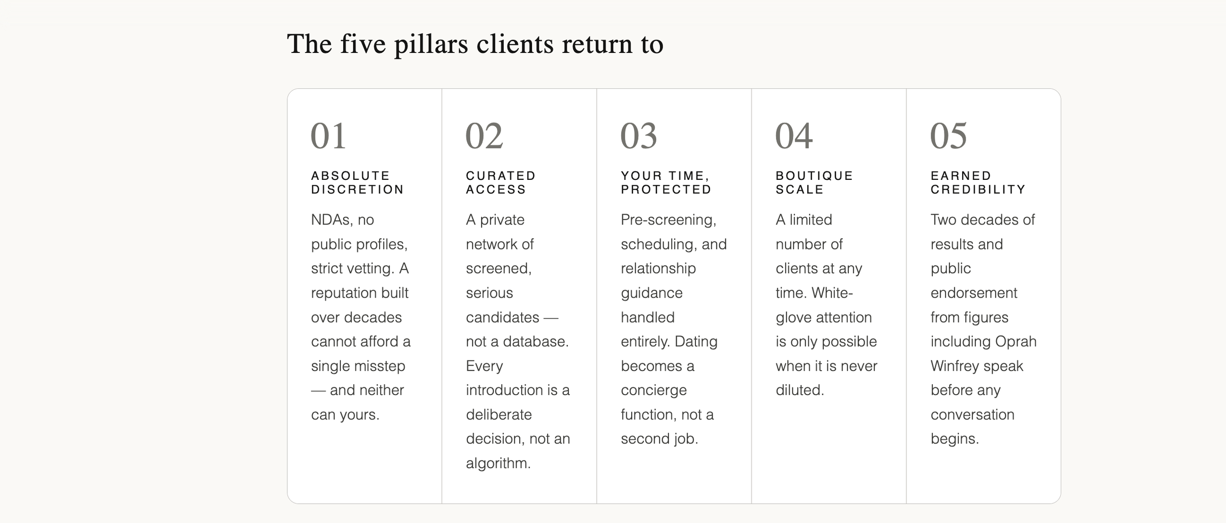 The difference is not accidental. It comes down to personal involvement and genuine vetting. Not high volume, not a search database and not a recognizable brand name. This is what separates quality high net worth matchmaking from the rest of the industry.